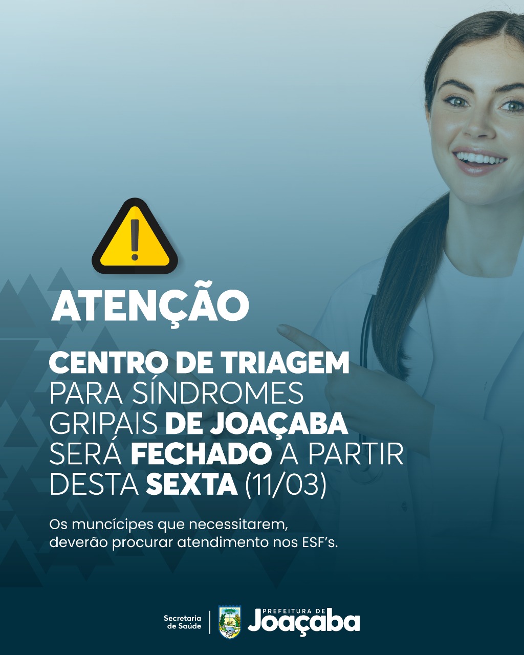 A Secretaria de Saúde de Joaçaba informa que a partir desta sexta-feira (11), (não terá atendimento), será interrompido os atendimentos no Centro de Triagem para Síndromes Gripais, na Rua Roberto Trompowsky, ao lado do Teatro Alfredo Sigwalt.