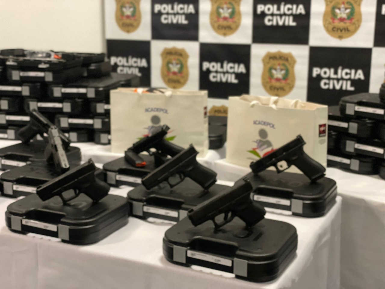 A Polícia Civil realizou nesta quarta-feira, 27, a entrega simbólica do novo armamento para a Instituição. Os investimentos são de R$ 8,5 milhões com a aquisição de 3.749 novas armas para a Polícia Civil, que passa a contar com pistolas 9 x 19 mm. O armamento é o mesmo utilizado pelo FBI e pela Polícia de Nova Iorque. As armas da marca Glock, modelos G17, G19 e G26, que agora são o novo padrão da Polícia Civil catarinense. O investimento é de R$ 8.574.439,67. Destes, R$ 7,5 milhões são do governo do Estado por meio do programa SC Mais Segura, R$ 587.418,10 são de emendas parlamentares estaduais e R$ 487.021,57 do Fundo de Melhoria da Polícia Civil de SC.