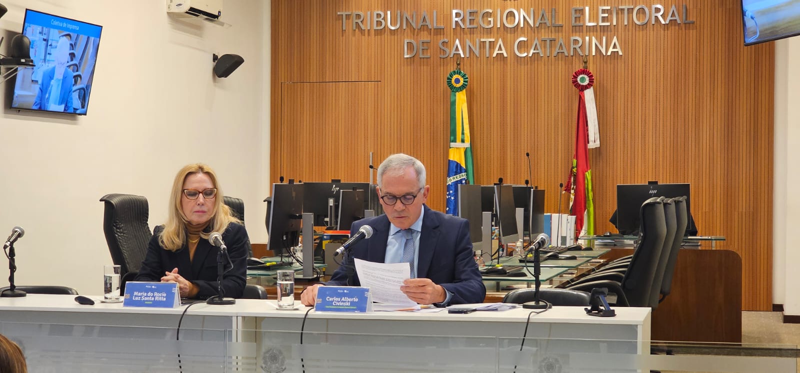 O Tribunal Regional Eleitoral de Santa Catarina (TRE-SC) realizou nesta terça-feira, 30, uma coletiva de imprensa para atualizar sobre o processo de preparação para as eleições de outubro e anunciar as novidades para este ano, que vão desde o combate à desinformação (em outras palavras, o combate as tão disseminadas fake news) por meio do uso de ferramentas de Inteligência Artificial, a documentação simplificada para mesários, através de folder, até a possibilidade de, agora, votar na legenda.