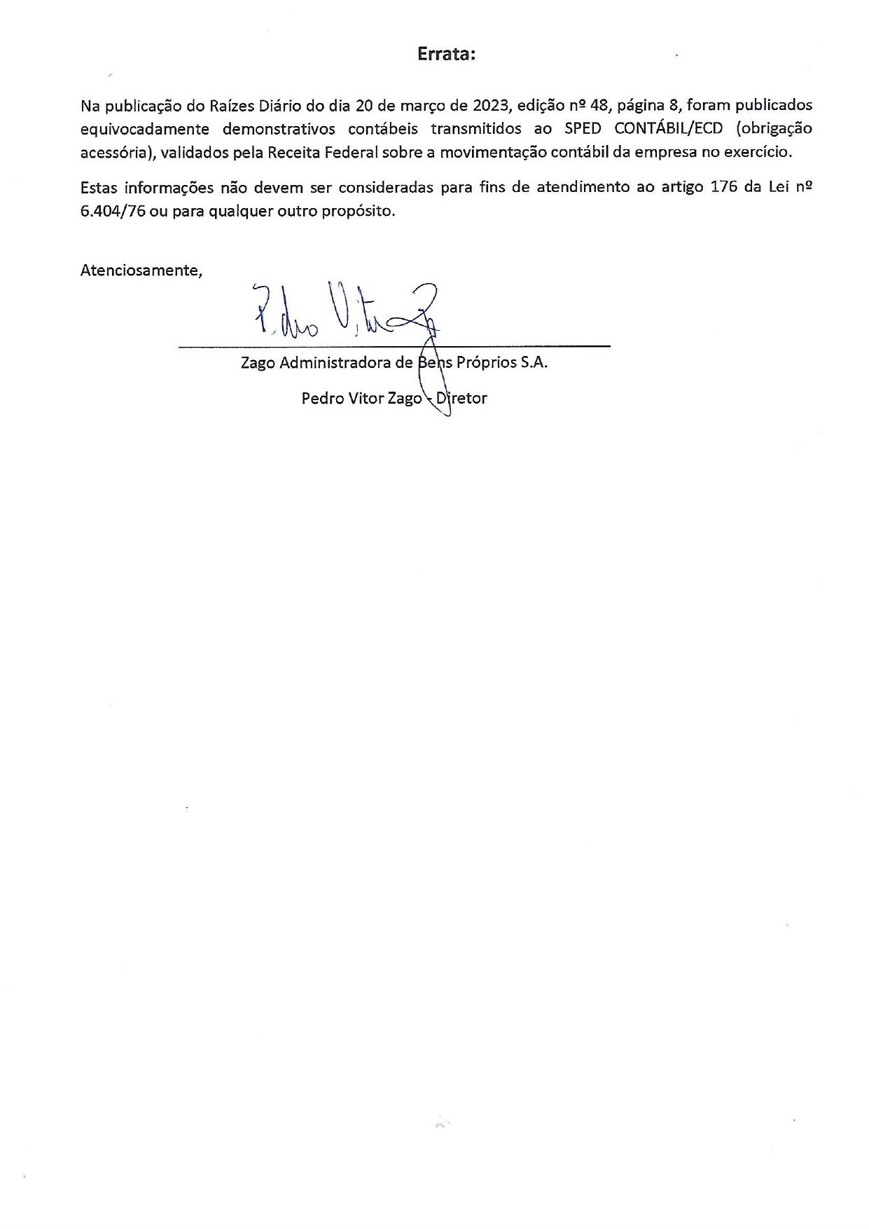 Na publicação do Raízes Diário do dia 20 de março de 2023, edição nº 48, página, foram publicados equivacadamente demonstrativos contábeis transmitidos ao SPED CONTÁBIL/ECD (obrigação acessária), validaddos pela Receita Federal sobre a movimentação contábil da empresa no exercício.