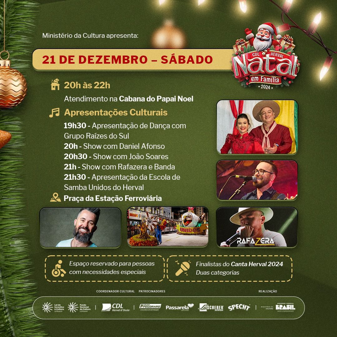 A programação do sábado (21) será a seguinte: 20h às 22h – Atendimento na Casinha do Papai Noel; 19h30 – Apresentação do Grupo de Danças Raízes do Sul; 20h – Show com João Soares; 20h30- Show com Rafazera e Banda; 21h – Show com Daniel Afonso; 21h30 – Apresentação Escola de Samba Unidos do Herval e Apresentações especiais dos finalistas das duas categorias do Canta Herval 2024.