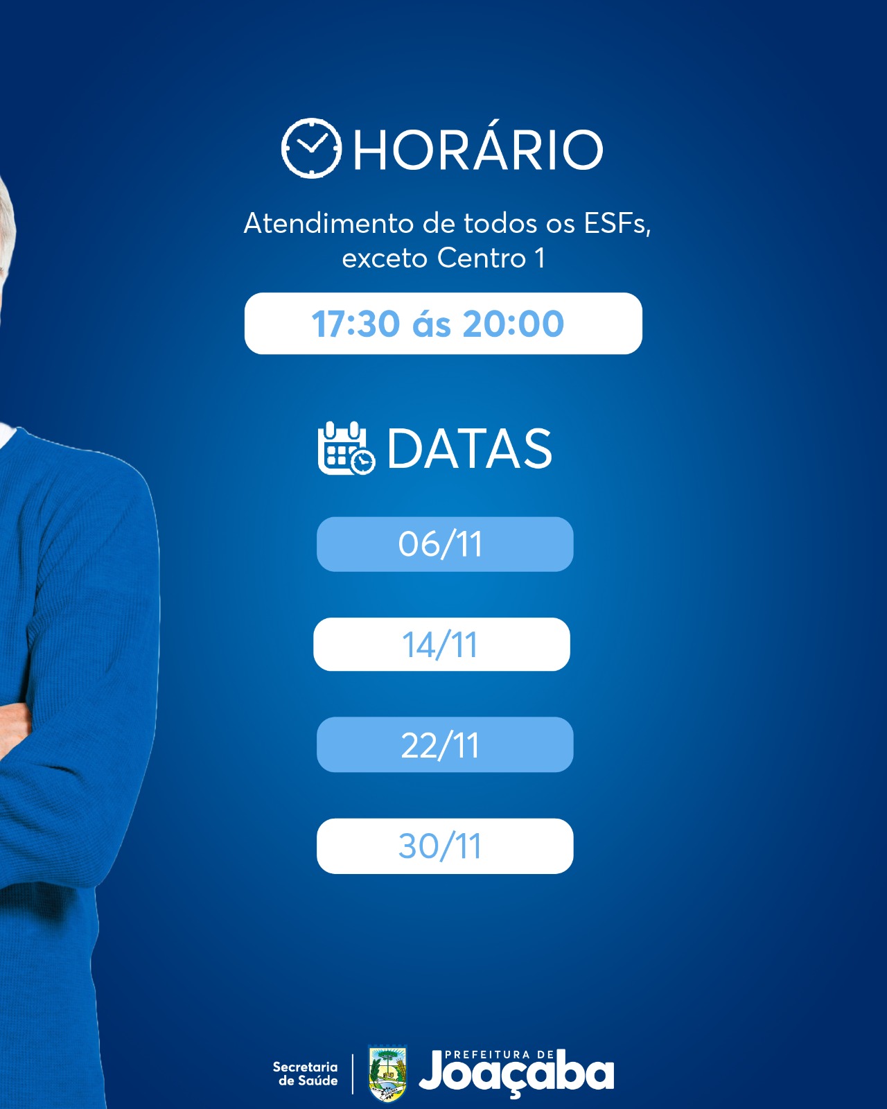 A Secretaria de Saúde de Joaçaba promoverá ações alusivas ao Novembro Azul, mês dedicado à prevenção do câncer de próstata e a saúde dos homens. Entre as ações, nos dias 6, 14, 22 e 30 de novembro (todos os ESFs, exceto o Centro 1) e nos dias 7, 13, 23 e 29 de novembro (apenas o ESF Centro 1), estarão atendendo em horário estendido, das 17h30 às 20h, homens que trabalham no horário comercial e tem dificuldade para realizar seus exames e consultas de rotinas.