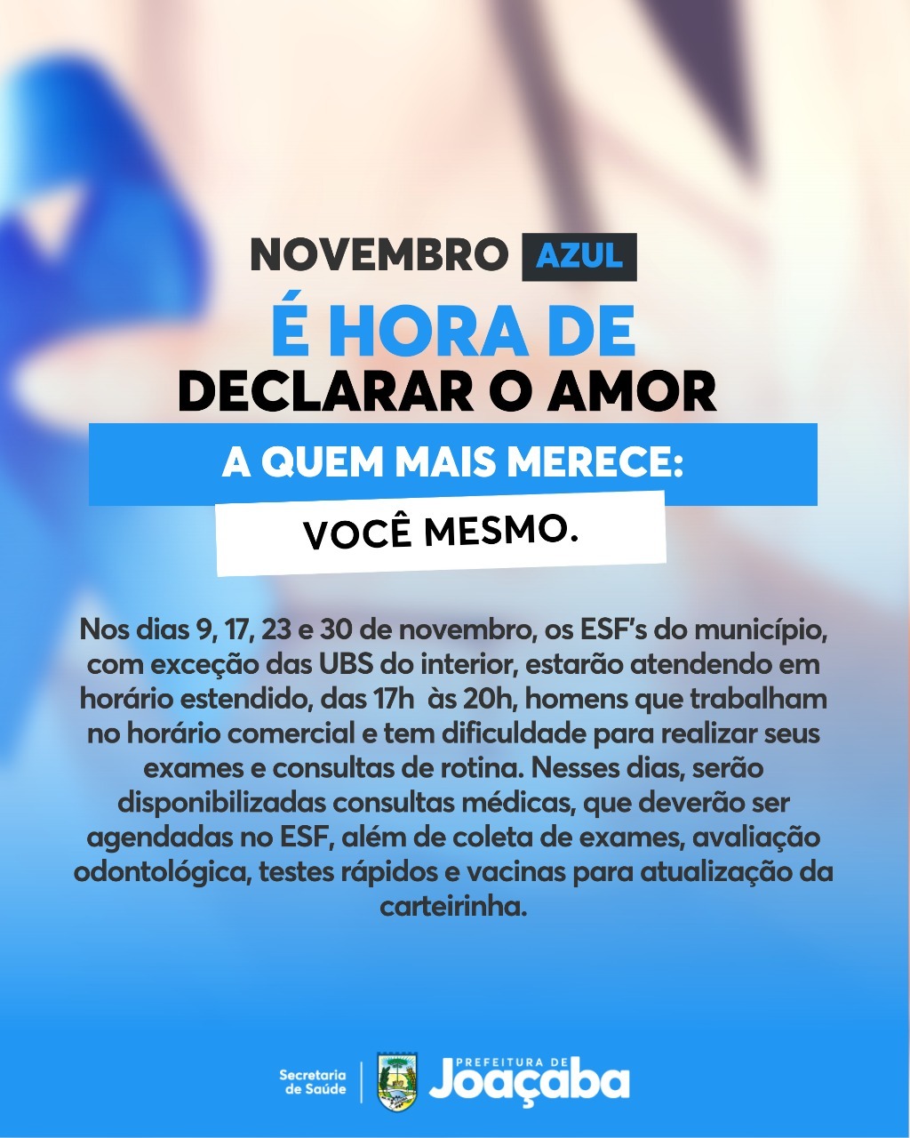 A Secretaria de Saúde de Joaçaba estará promovendo ações alusivas ao Novembro Azul, mês dedicado à prevenção do câncer de próstata e a saúde dos homens. Entre as ações, nos dias 9, 17, 23 e 30 de novembro, os ESF’s do município, com exceção das UBS do interior, estarão atendendo em horário estendido, das 17h às 20h, homens que trabalham no horário comercial e tem dificuldade para realizar seus exames e consultas de rotina.