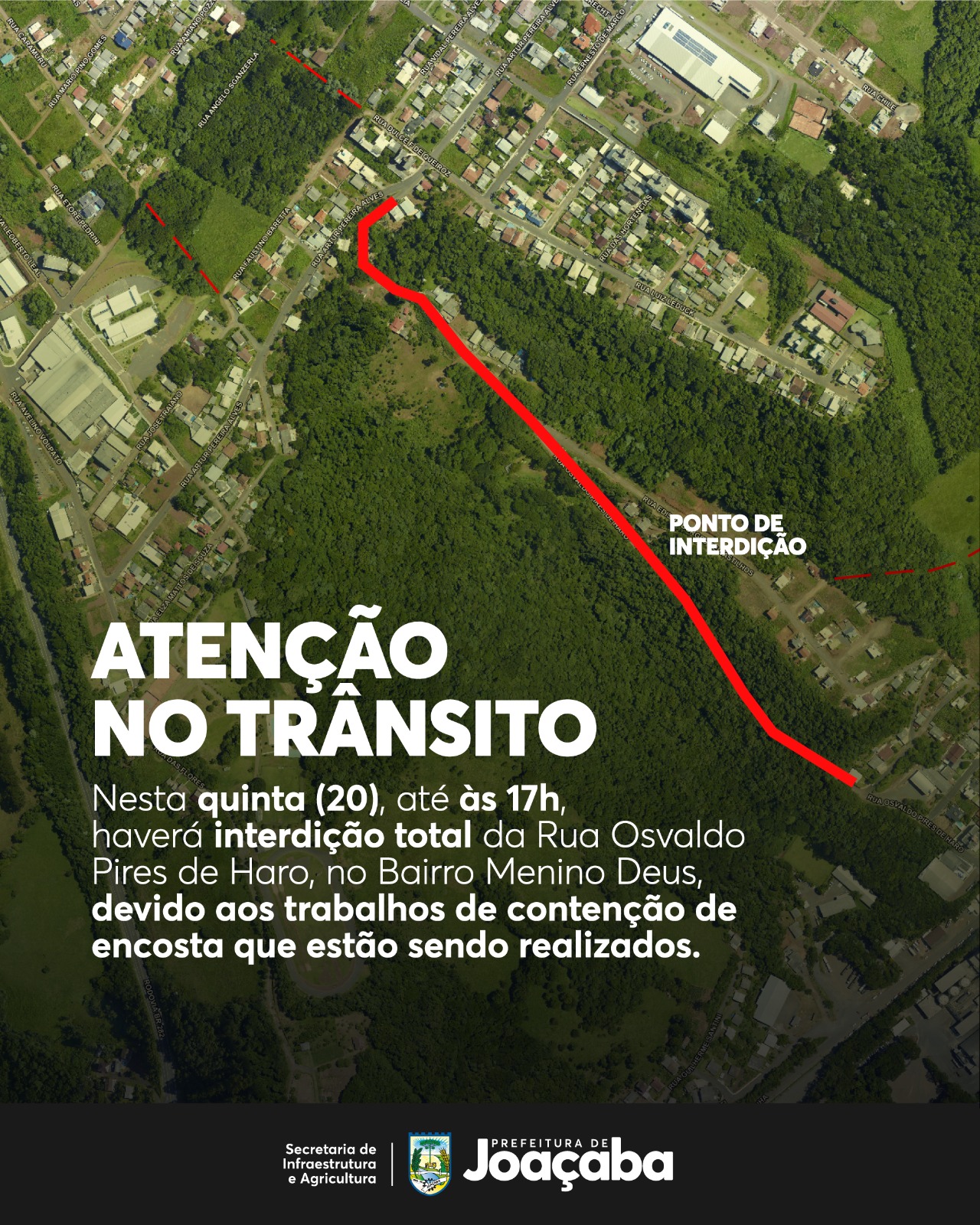 O Departamento de Trânsito, Transporte e Mobilidade Urbana da Prefeitura de Joaçaba informa que, nesta quinta-feria (20), a Rua Osvaldo Pires de Haro, no Bairro Menino Deus, estará fechada para circulação de veículos e pedestres. O fechamento se deve aos trabalhos de contenção que estão sendo realizados na via, visando garantir a segurança de todos durante a execução dos serviços com máquinas e trabalhadores.