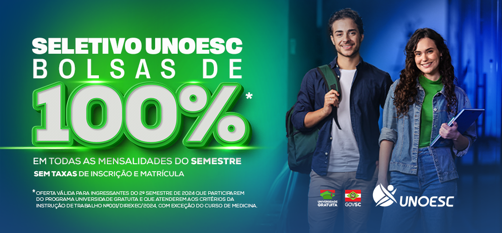 Estão abertas as inscrições para o Seletivo Unoesc, com matrículas gratuitas e bolsas de 100% de desconto em todas as mensalidades do segundo semestre de 2024. Os interessados podem acessar o edital, obter mais informações e se inscrever pelo site da Universidade (https://vestibular.unoesc.edu.br/). As aulas iniciam no dia 29 de julho.